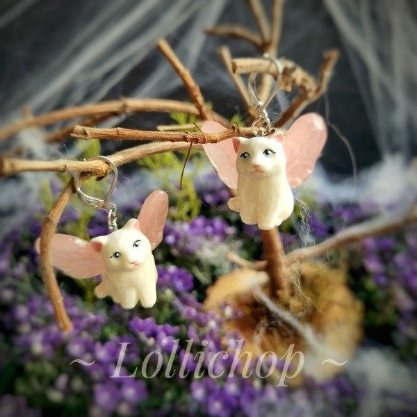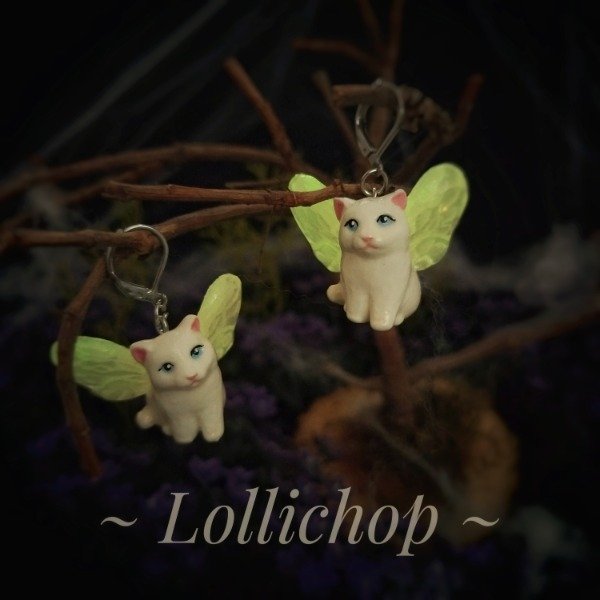 Los dijes de gatitos son de porcelana fria liviana hechos de una pieza sólida y las alas de resina epoxy color rosa. Las alas brillan en la oscuridad en color verde