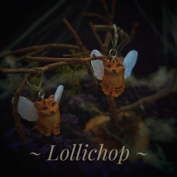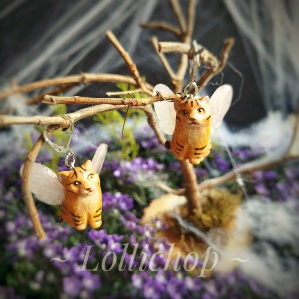 Los dijes de gatitos son de porcelana fria liviana hechos de una pieza sólida y las alas de resina epoxy color lila. Las alas brillan en la oscuridad en color celeste
