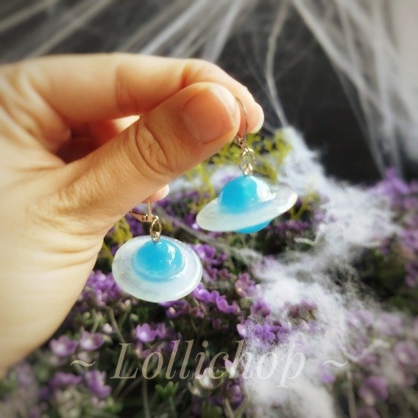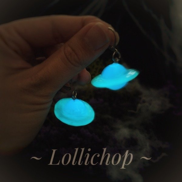 Los dijes son de resina epoxy. Los aros son de color azul con blanco que brillan en la oscuridad en color celeste.
